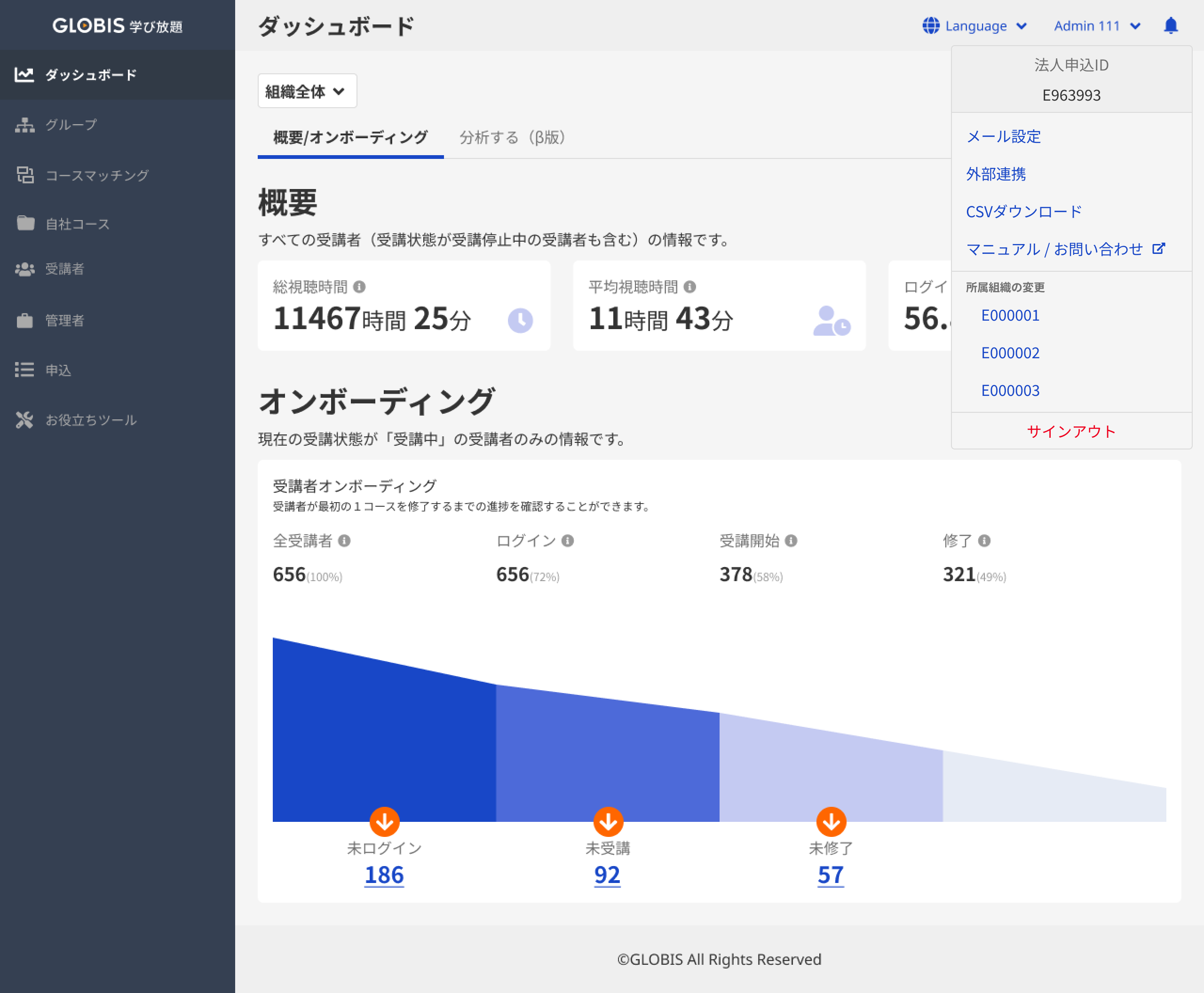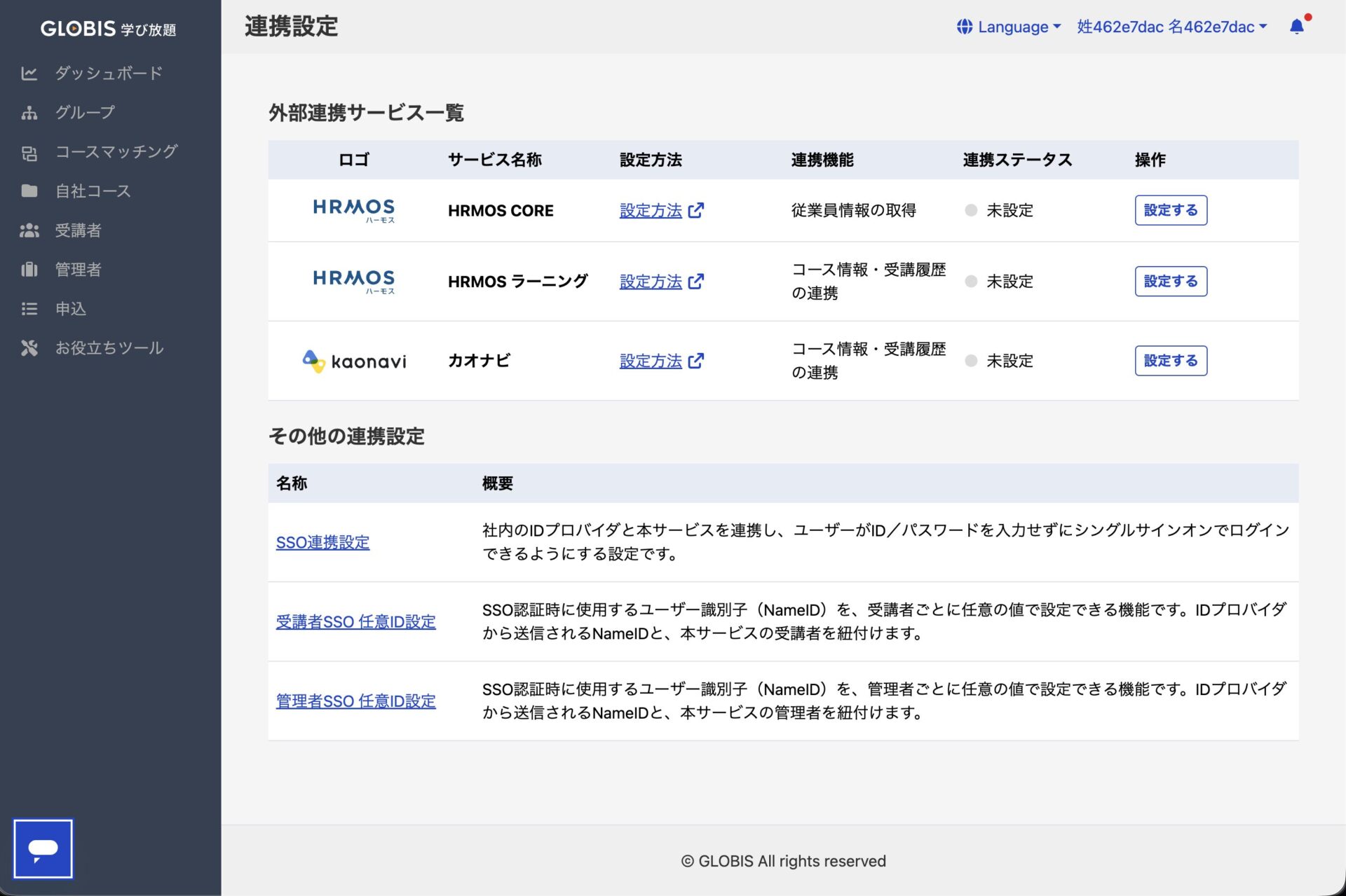 グロービス学び放題の法人管理画面にログインし、右上のメニューから「外部連携」を選択してください。