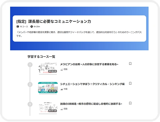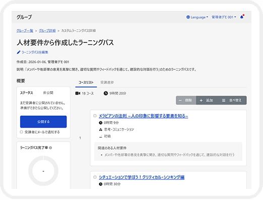 さらに、興味関心に応じたレコメンドや、受講促進メールの自動配信、学習の進捗を効率的に管理できる仕組みも完備しており、受講者の積極的な学びを促します。