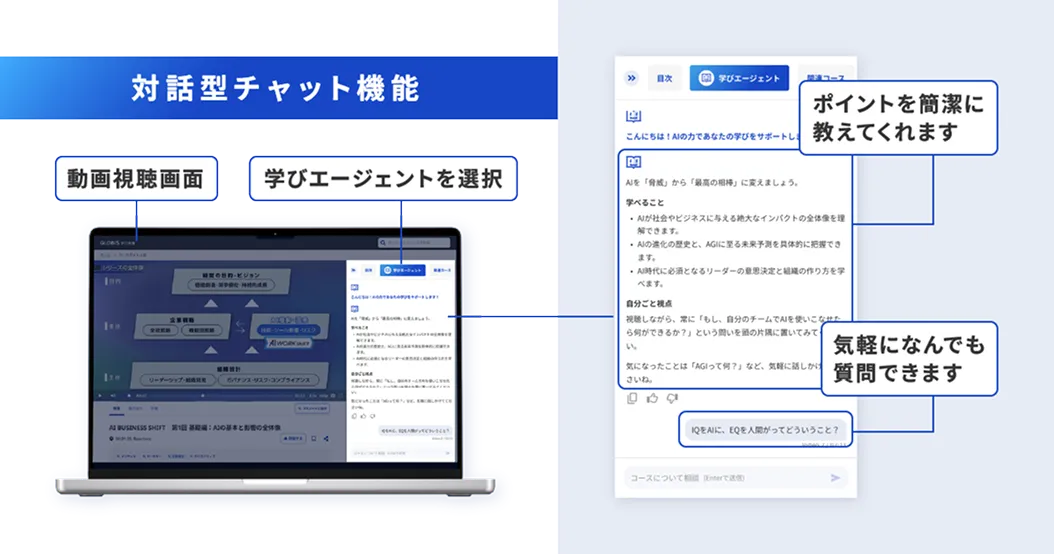 コース内で登場する用語やフレームワークなど、学習中の疑問はチャットで質問すれば、AIがその場ですぐに回答。スムーズに理解を深められます。