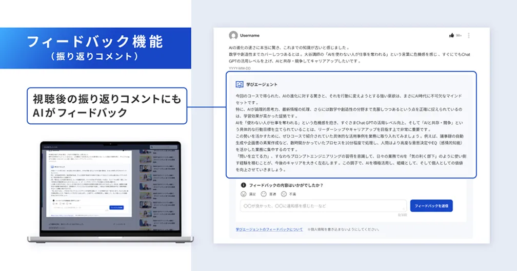 コース視聴後には、AIとの対話内容を要約。業界やポジションに合わせた、実務に活かすために役立つツールも提供します。さらに、振り返りコメントを入力すれば、AIがフィードバック。理解度やズレを補正し学びの定着と実践をサポートします。 -