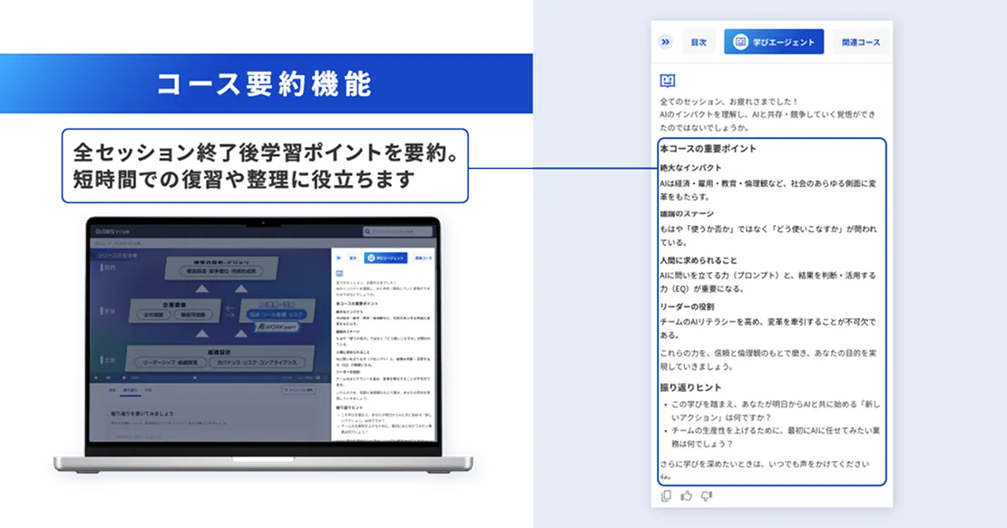 更にコース視聴後にはAIが要点を要約してくれるので、学びの全体像の整理や復習も簡単に可能です。 -