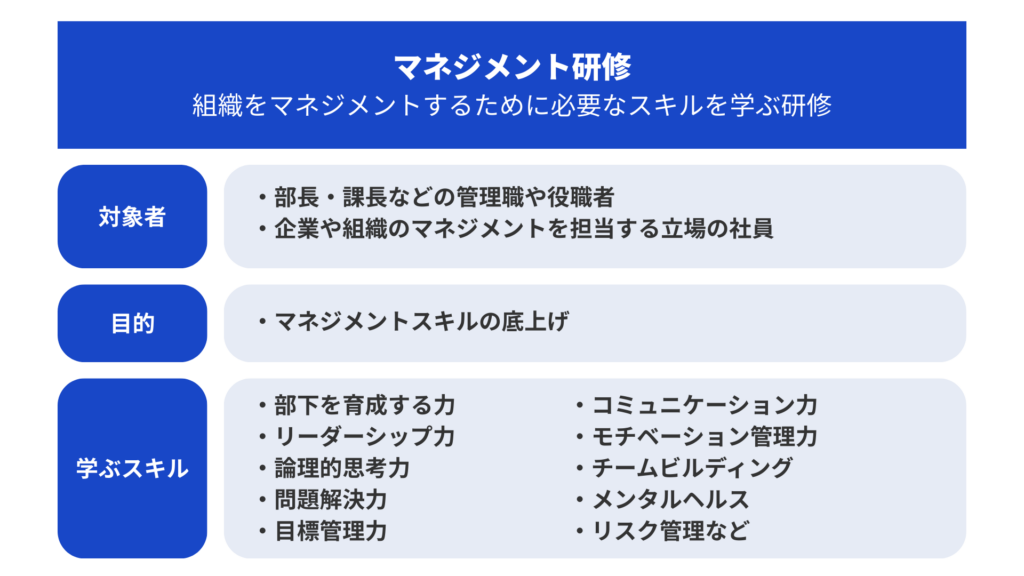 部下を育成する力やコミュニケーション力、リーダーシップ力など、組織をマネジメントするために必要なスキルを学ぶ研修のこと。