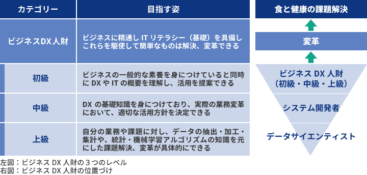 永島さん:ビジネスDX人財とは、ビジネスに精通しITリテラシー(基礎)を具備し、これらを駆使して簡単なものは解決、変革できる人財と位置付けています。初級、中級、上級と3つのレベルを設定しており、初級はDXやITの概要を理解し活用を提案できるレベル、中級はDXの基礎知識を身に付け、実際の業務変革において適切な活用方針を決定できるレベル、上級は自分の業務や課題に対してデータの抽出、加工、集計や、統計・機械学習アルゴリズムの知識をもとに課題解決や変革ができるレベルを想定しています。必要に応じてシステム開発者やデータサイエンティストの力を借りるので、そういった専門家と同じ立場で話ができる人財の育成を目指しています。このビジネスDX人財の初級育成を目的として、2020年から統計学やビジネススキル、機械学習、AIの活用法などを学ぶ認定プログラムがスタートしました。