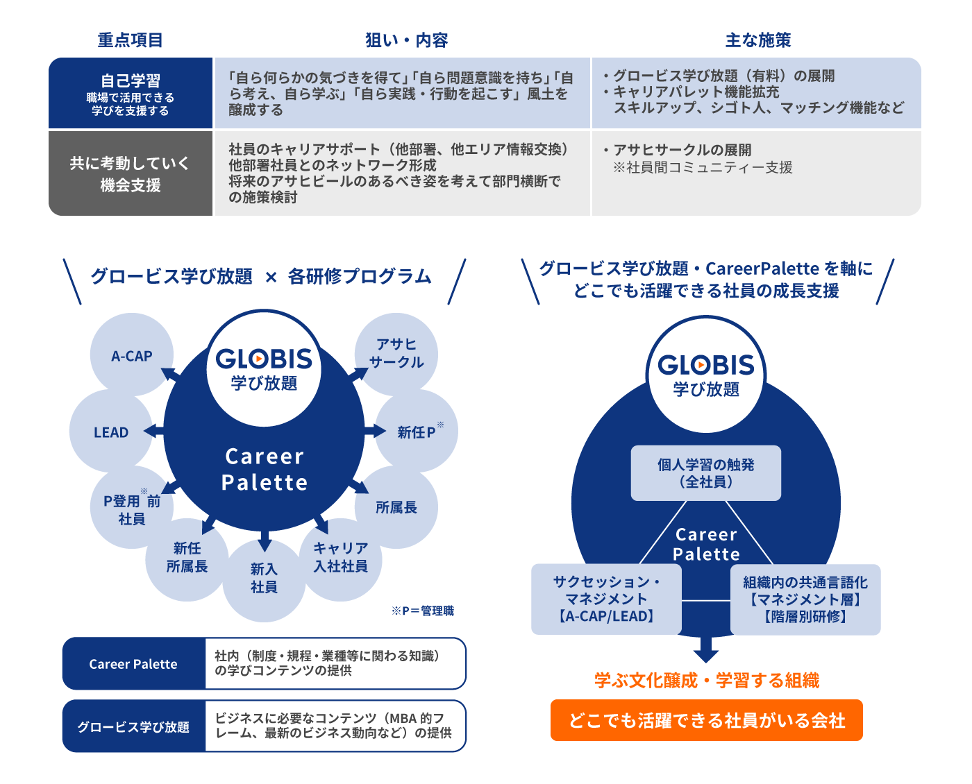 村瀬さん:冒頭でもお話ししましたが、今後は集合研修だけにとらわれない育成制度を展開していきます。といっても社員の学びを促すだけでなく、社員ひとり1人の学ぶ意欲を掻き立てるような施策を企画し、実践するのが私たちの役割だと考えています。「アサヒビールに入社して成長させてもらえた」という受け身な姿勢というよりは、「アサヒビールで自ら成長できた」と思ってもらえるような、社員が主体的に成長できる会社であり続けられたら、と願っています。