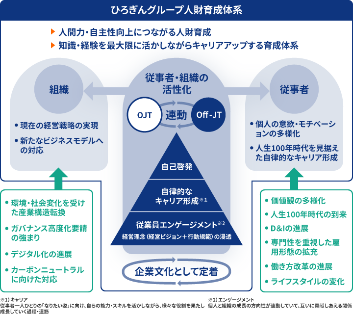 大多和さん:金融業界の産業構造が大きく変化しているだけでなく、金融庁がまとめたコーポレートガバナンス・コードの遵守やデジタル化、SDGsなどに対応しながら経営戦略を実現し、さらにグループとして新しい事業や新しいビジネスモデルを生み出していく必要があります。一方で人財育成に焦点をあてると、人生100年時代を見据えた個々の社員の自律的なキャリア形成や人財に企業としてどうあたるべきか、という課題も見えています。特に2020年のホールディングス化以降は人財の流動性も加速しており、グループ全体の育成体系を定め、今もまさに経営戦略と人財戦略を連動させる取り組みを推進している最中です。