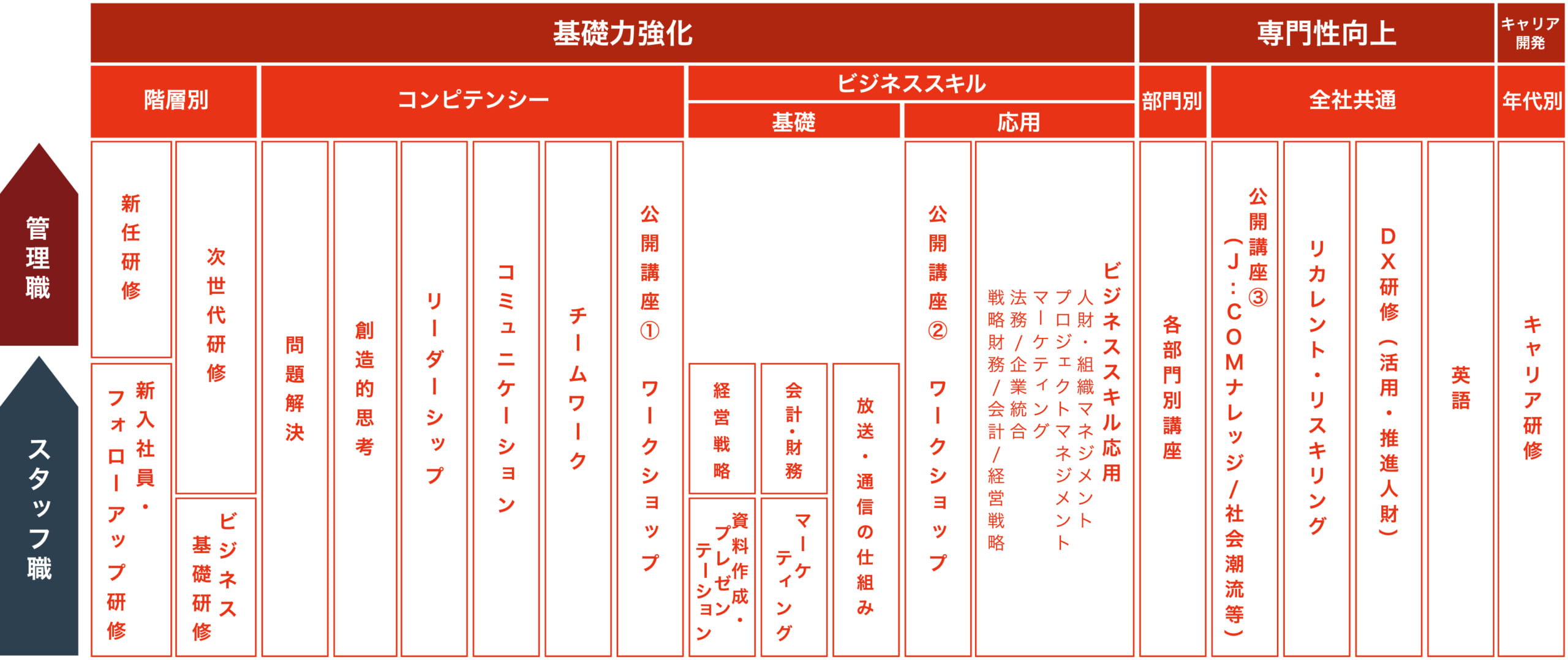 専門性向上についても、部門や個人に任せていたところがありましたが、全社視点で横串を刺して向上させていくことを目標としました。コンピテンシーとビジネススキルの基礎力を底上げしていくことを目指し、新研修制度を構築しました。