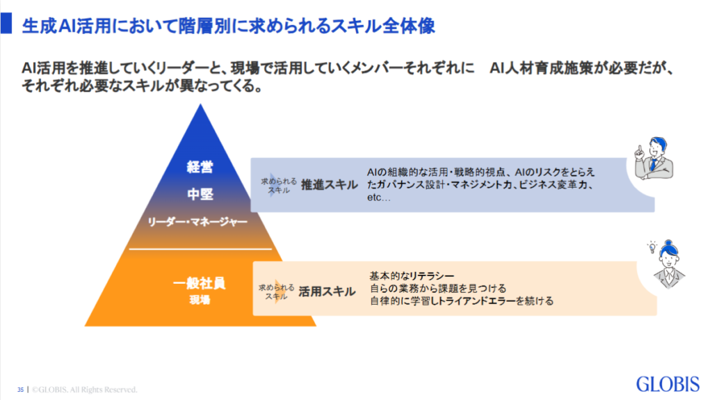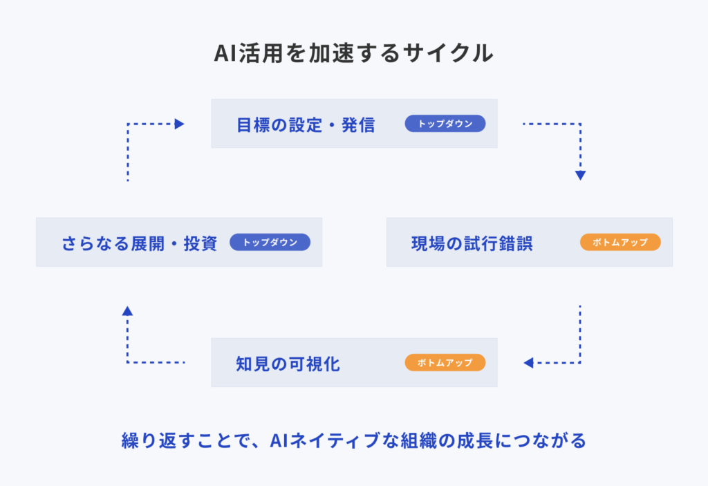 真に重要なポイントは、「トップダウンでの発信」と「ボトムアップのリテラシー向上」の組み合わせによって「AI活用が当たり前」な組織へ変革させていくことです。