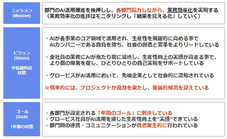 グロービスでは、全社的なAI活用を推進するため、以下の点を意識して進めてまいりました。