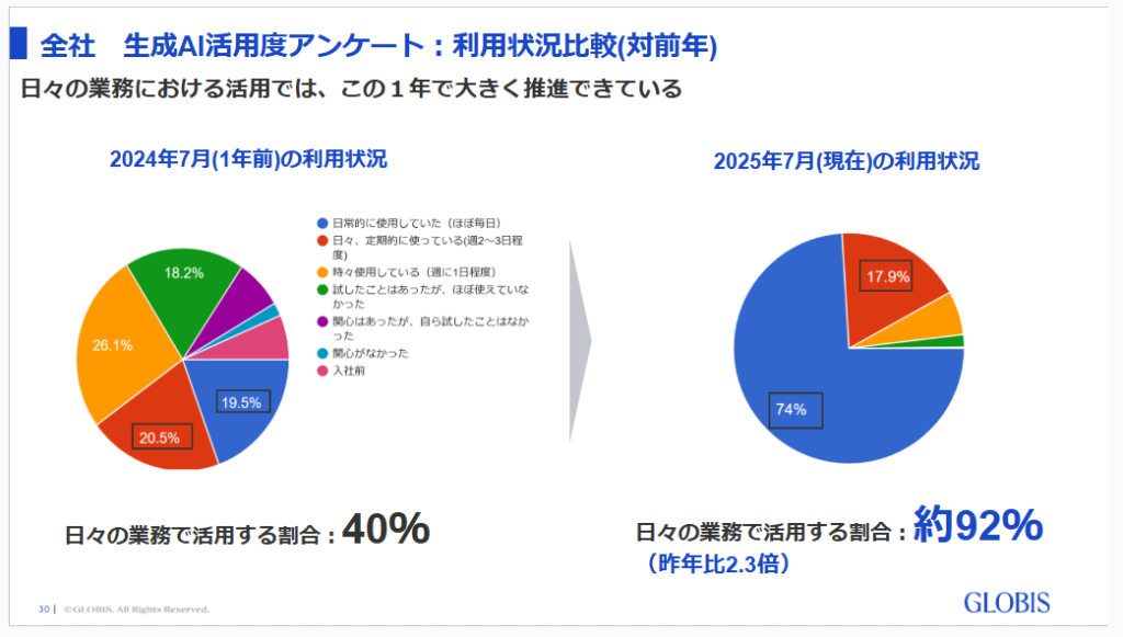 こうした取り組みの結果、「全社活用度アンケート」では、業務におけるAI使用率が対前年比で40%から92%へと上昇しました。約2.3倍の大幅な使用率の上昇に成功しています。