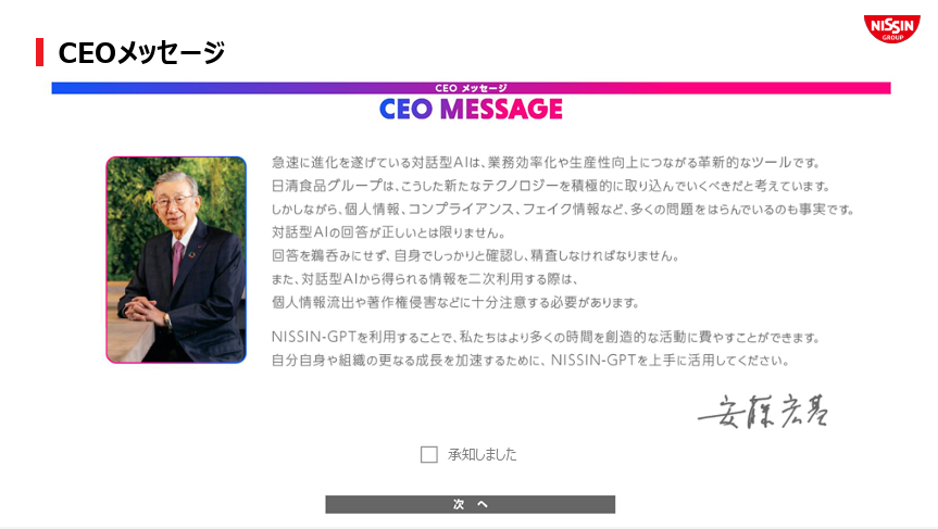 例えば日清食品では、2023年度の入社式にてCEOの安藤宏基氏からGPTを用いたメッセージを発表し、社員が初めてGPTにログインした際にもCEOメッセージが表示される仕組みを導入しています。