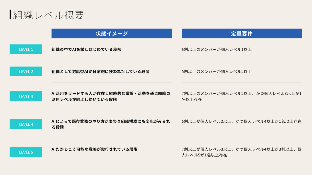 また、効果測定によるさらなる活用促進のため、DeNAは「DeNA AI Readiness Score(DARS)」という独自指標を導入しています。個人レベルと組織レベルの二つの観点から5段階で策定されました。DeNAはこの指標を 2025年8月末から運用開始し、2025年度末までに全組織が組織レベルでレベル2に到達することを目標と設定しました。