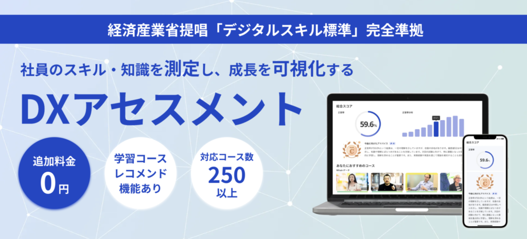 更に、アセスメント機能を活用することで、スキルを定量的に可視化し目的に沿ったスキル獲得を促進できます。実際に八千代エンジニヤリング株式会社様では、全社のDX推進のために「グロービス学び放題」のDXアセスメントを活用されています。