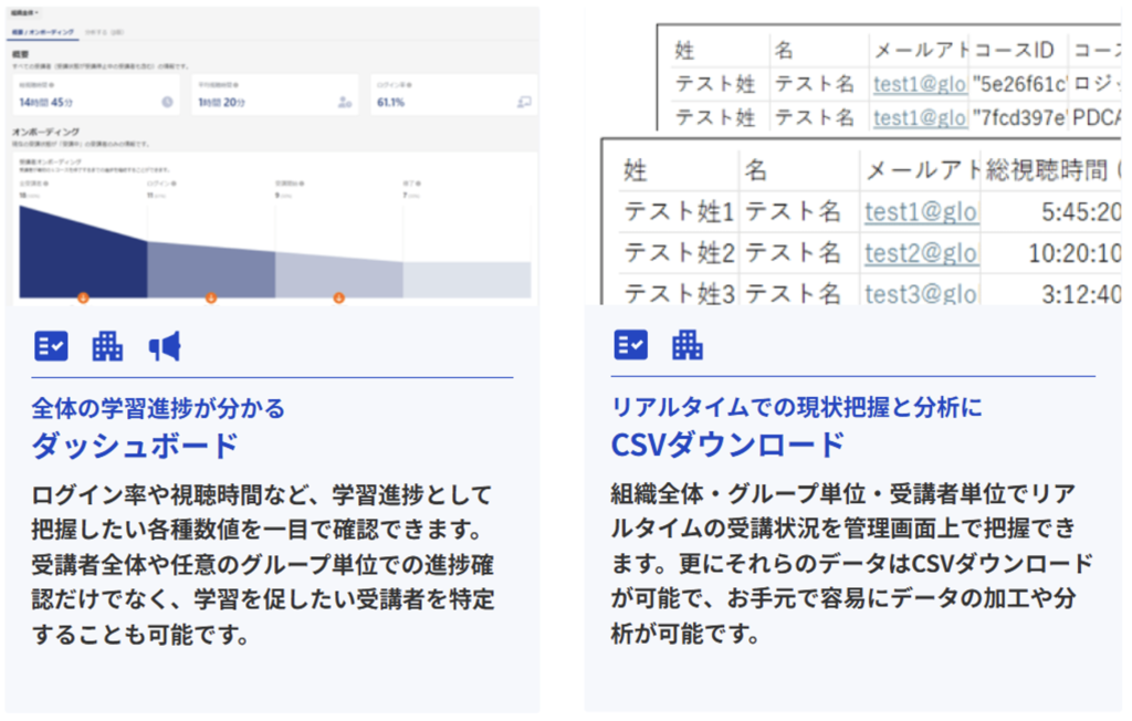 | 学習進捗の把握・管理 | 受講データ分析 | |