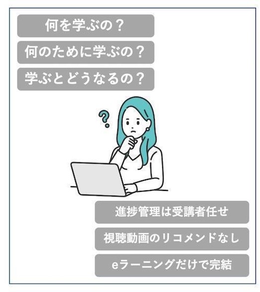 - eラーニングでのインプットのみで、振り返りやアウトプットの機会がない