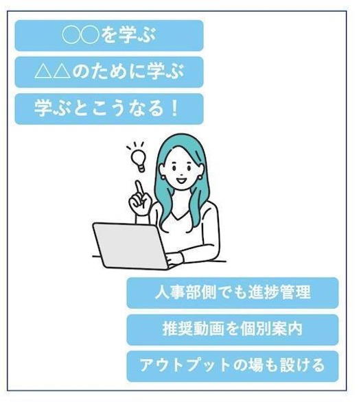 ・人事部側でデータ分析し、弱い分野、不足しているジャンルが判明すれば、視聴が推奨される動画を個別に案内する