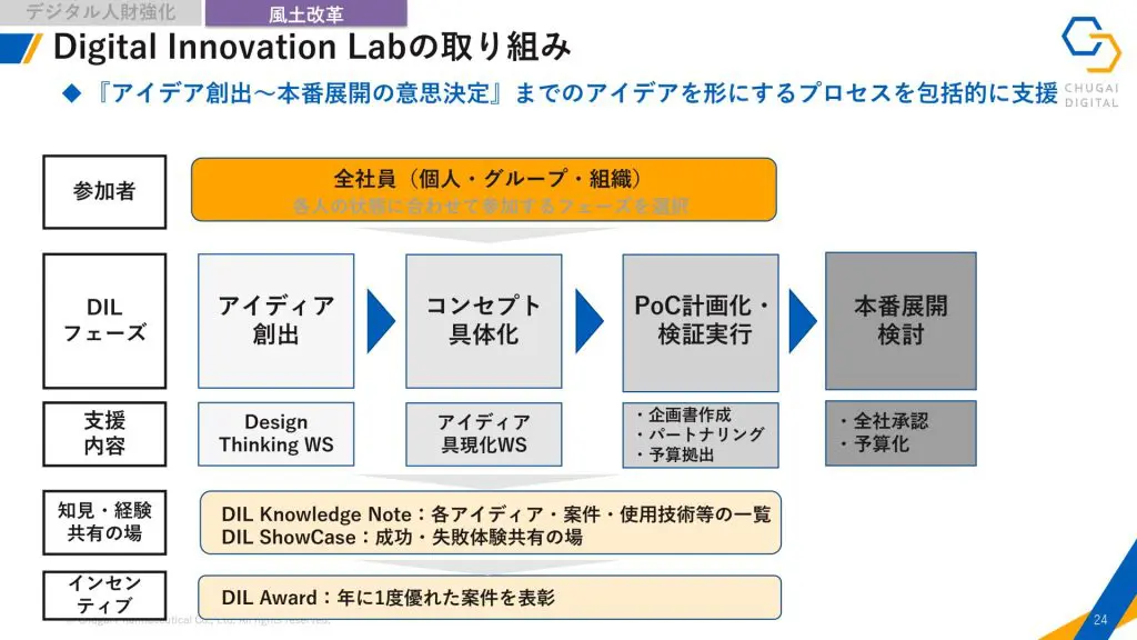 続いて、風土改革について説明。施策の一例がDigital Innovation Lab(DIL)の取り組みだ。「アイデア創出から本番展開の意思決定まで」のアイデアを形にするプロセスを包括的に支援するもので、全社員が上司の許可不要で応募でき、デジタルツールを使ってそれぞれの課題にアプローチしていけるものだという。アイデア創出の手助けをするデザインシンキングのほか、アイデア具現化ワークショップを実施し、企画書の作成をサポートとすると共に、PoC(概念実証)費用も拠出。成功・失敗事例の共有会の実施に加え、特に顕著な成果が出たものは表彰もしている。