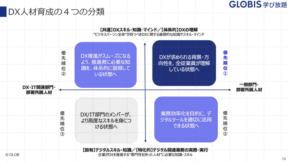 「人材育成に向けて必要な人材の定義や育成内容で迷っている場合は、大変参考になると思います。『GLOBIS 学び放題』でも、デジタルリテラシー標準に準拠したコンテンツを用意しています。こちらも参考にしながら、各企業に合った育成プランの計画を立ててください」