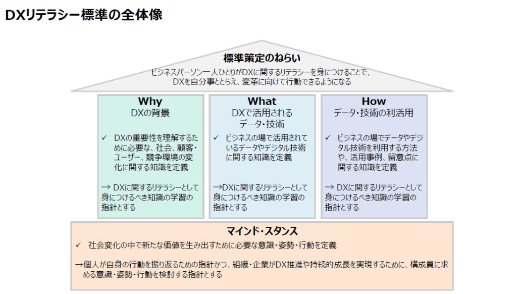 「DXリテラシー標準」の全体像は以下のとおり。DXリテラシーを身につけることによって何を狙うかが屋根の部分であり、ベースとしてマインド・スタンス(変革していく上での心構え)が非常に重要であることを示している。3本の柱は「Why」「What」「How」だ。