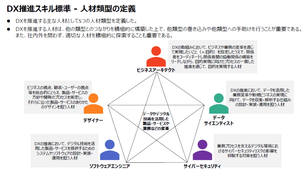 「DX推進スキル標準」の人材類型の定義は以下のとおり。ここでは五つの人材類型について定義している。今回はデータサイエンティストにフォーカスした講演だが、DXを推進する人材は、他の類型とのつながりを積極的に構築することが重要。データサイエンティストについてより理解を深めるためにも、類型の定義と可視化が有意義だ。