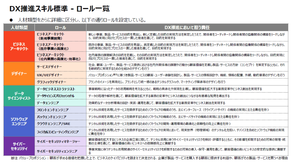人材類型をさらに詳細に区分し、DXにおいて果たすべき責任の観点からロールとして展開した一覧が以下のとおり。15種類のロールを設定しているが、15人必要であるわけではない。各企業が進めようとするDXの内容に応じて必要なロールにも濃淡があり、さらには一人が複数のロールを兼ねることもある。一つのロールをチームとして対応することもある。