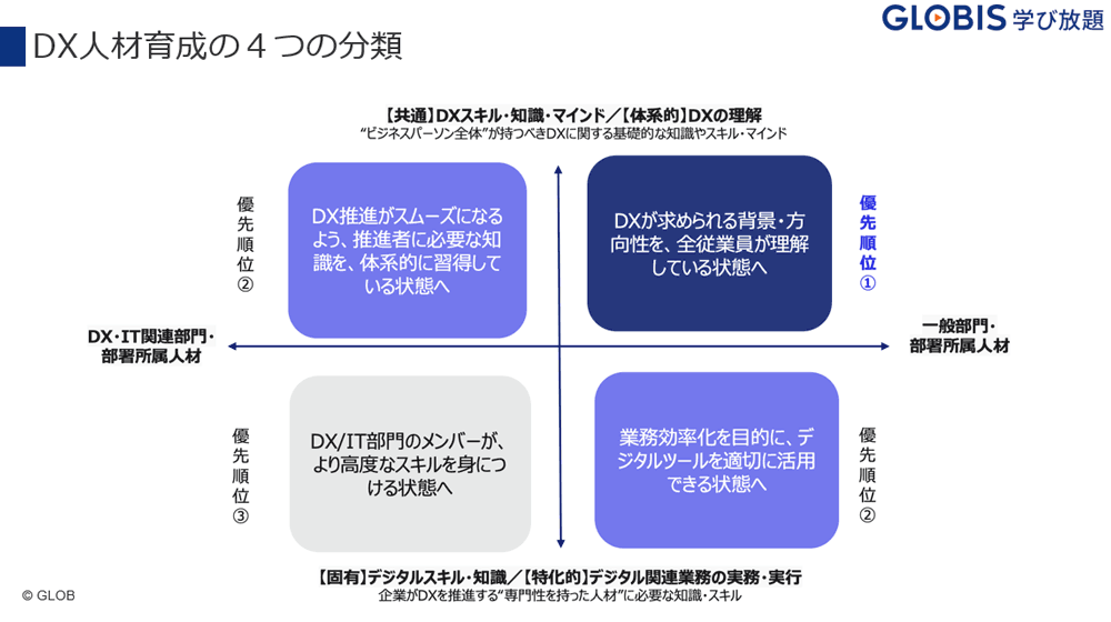 講演の冒頭で、鳥潟氏はまずグロービスの事業を説明した。グロービスは日本最大のビジネススクールであるグロービス経営大学院を運営しており、社会人教育やMBA、研修など人材育成に特化したサービスを幅広く提供している。 「GLOBIS 学び放題」は、ビジネス領域からIT、デザインまで、さまざまなテーマで2,200のコースを受講できる定額制動画学習サービスだ。MBAのコンテンツを軸としながら、DX系を含む最新のビジネスナレッジを毎月追加している。「GLOBIS 学び放題」では、2023年度の講座から、「デジタルスキル標準」に準拠したコースラインアップも充実させている。