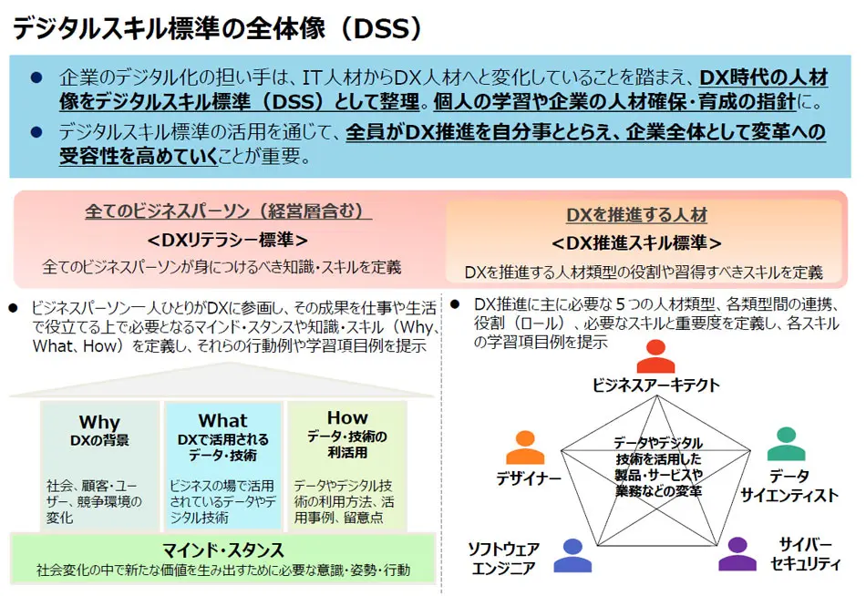 デジタルスキル標準は、全てのビジネスパーソンが身につけるべき知識・スキルを定義した「DXリテラシー標準」と、DXを推進する専門人材の役割や習得すべきスキルを定義した「DX推進スキル標準」の二つで構成されている。