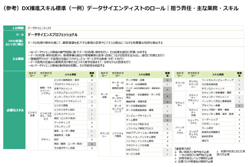 ポイントは、共通スキル項目がその名の通り、五つの人材類型の全てに共通して必要とされるスキルとして定義されていることだ。例えば、データサイエンティストの人材類型の中のデータサイエンスプロフェッショナルという役割。「ビジネス変革」カテゴリー内の「ビジネス戦略策定・実行」というスキルの重要度は「d」とある。一方で、「データ活用」カテゴリー内の「機械学習・深層学習」というスキルの重要度は「a」となっている。このように、共通スキル項目の全てがそれぞれの役割によって重要度「a」から「d」までの重み付けがされているのだ。