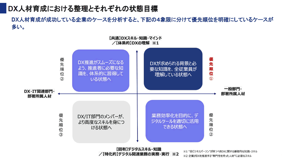 第一象限の「DXが求められる背景と必要な知識を全社員が理解している状態」が、優先順位1位だ。その上で、第二象限の「DX推進者が必要な知識を体系的に習得している状態」と、第四象限の「一般従業員がデジタルツールを適切に活用できる状態」が優先順位2位となる。そして、最終的に第三象限の「DX/IT人材がより高度なスキルを身につける状態」を目指す、という流れだ。