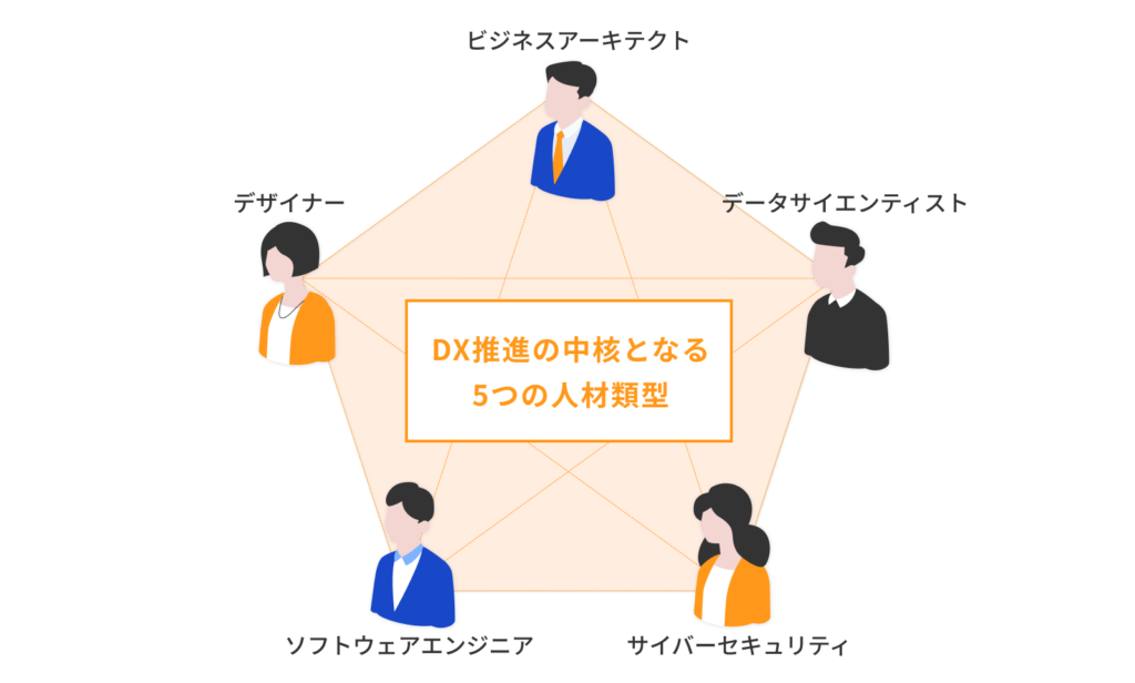 冒頭でも触れたように、DX推進スキル標準とは「企業がDXを推進するうえで必要な専門人材を確保・育成するための指針」です。DX推進に関わる主要人材を5つの類型に分け、それぞれに求められる役割、スキルを定義しています。