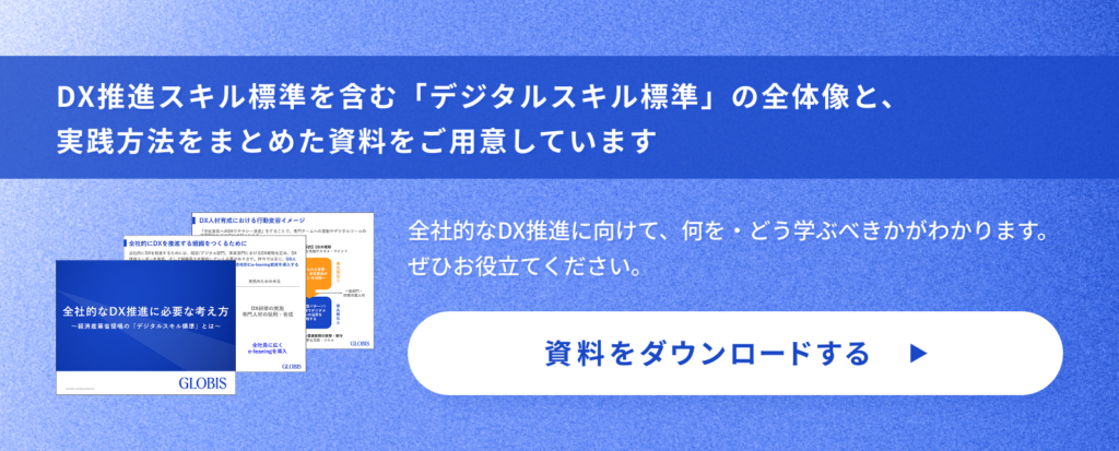 この記事では、DX銘柄企業(※)の94%が導入している動画学習サービス「GLOBIS 学び放題(以降、グロービス学び放題)」の提供元であるグロービスが、DX推進スキル標準の全体像と具体的な活用方法を解説します。