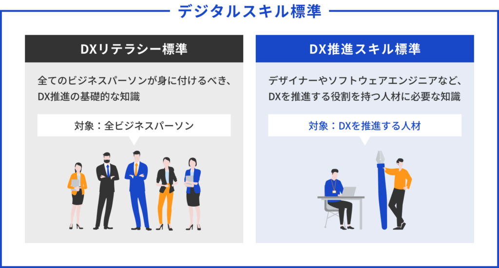 デジタルスキル標準は、「DXリテラシー標準」と「DX推進スキル標準」の2つに分類されています。