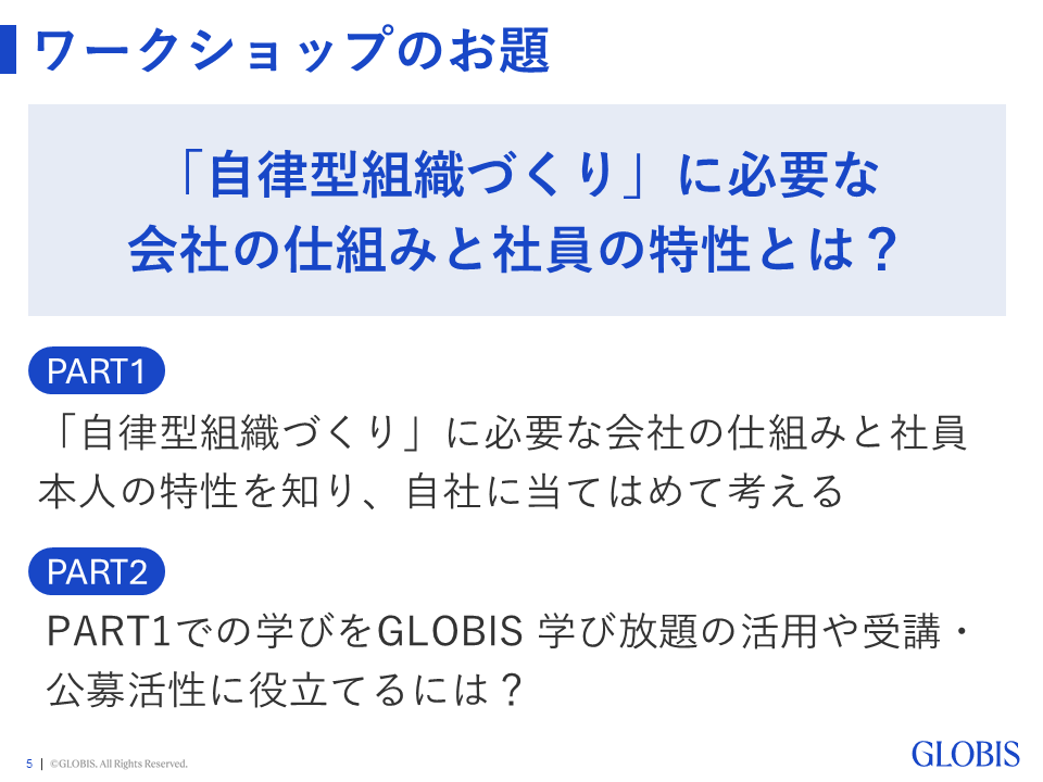 GLOBIS学び放題 法人事業チームのリーダーでカスタマーサクセス担当である成田より、「自律型人材について参加者全員で考え、自社に活かせる気づきを持ち帰ってもらう」為の人事ワークショップが開催されました。
