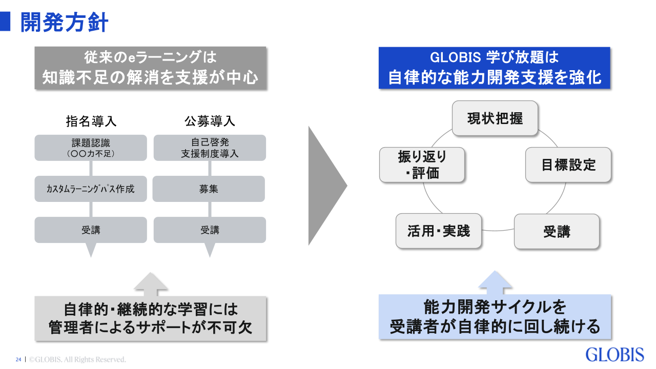 自律的に学ぶ人材・組織づくりには、それらが機能する仕掛けが重要。GLOBIS学び放題は、能力開発サイクルを受講者が自律的に回し続けることができるサービスを目指します。