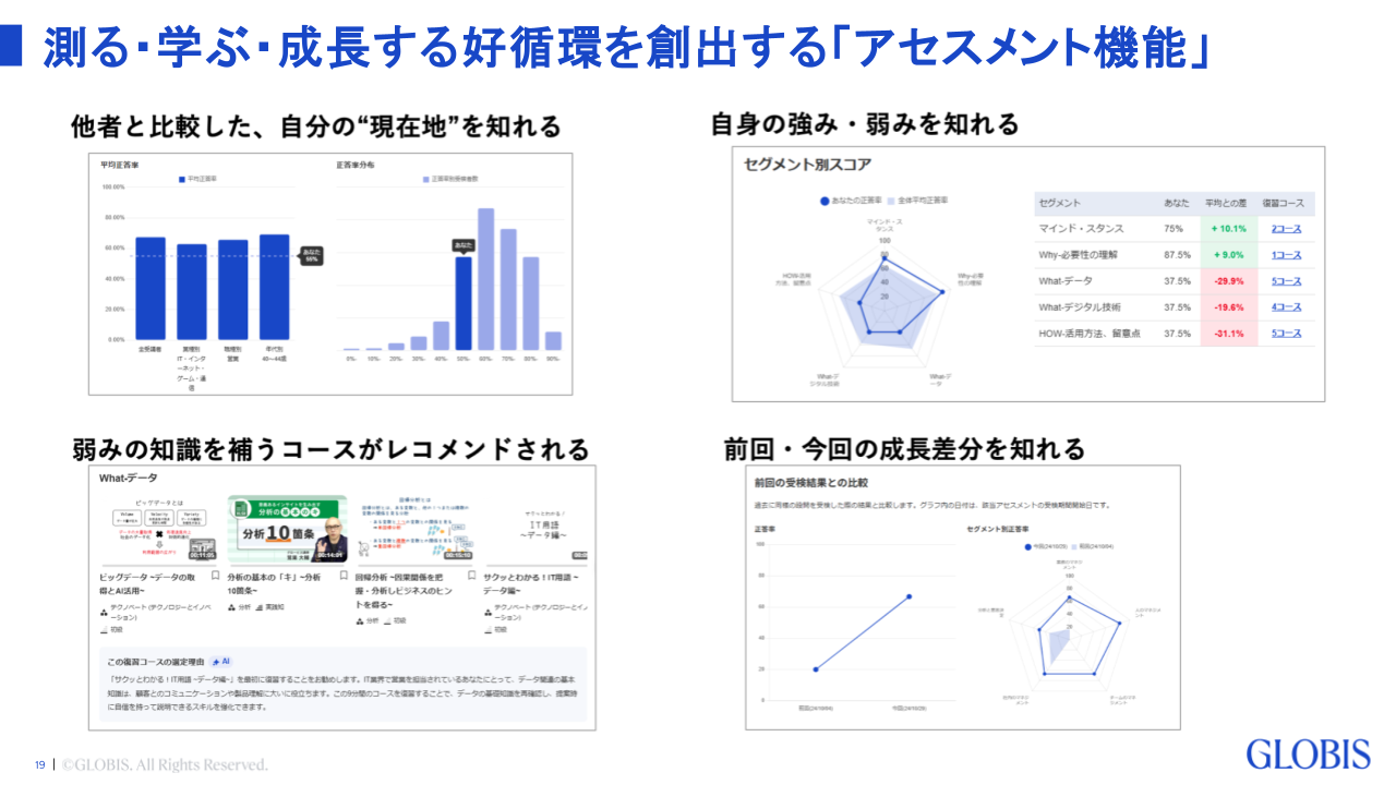 最新機能の一つとして、今年11月に大幅アップデートを行ったアセスメント機能もご紹介。昨年実装したDXアセスメントに加えて、営業やマーケティングといった領域別、新人・若手や管理職向けといった階層別まで、新たに8種類のビジネスアセスメントをリリース!