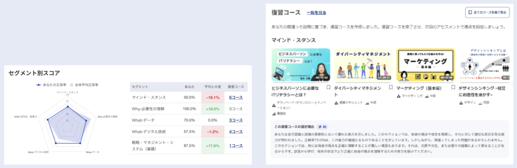 結果に応じて 個別化された学習コースがレコメンドされ、AIによって具体的なアドバイスを提供。