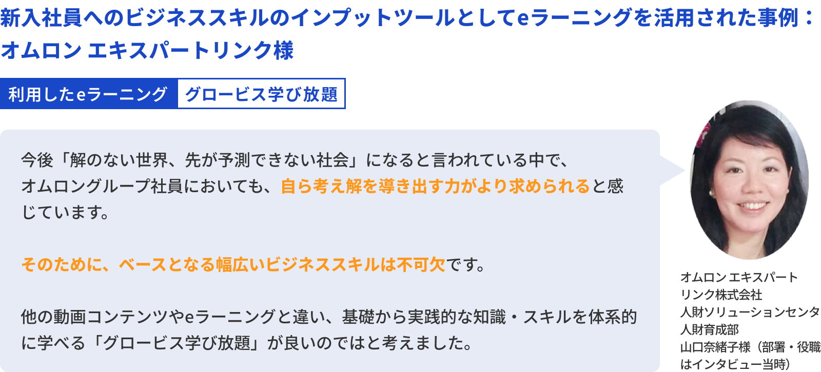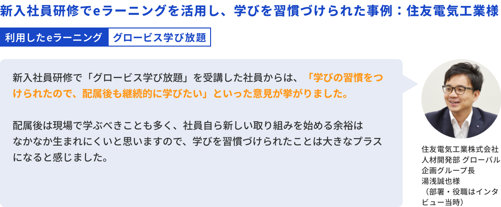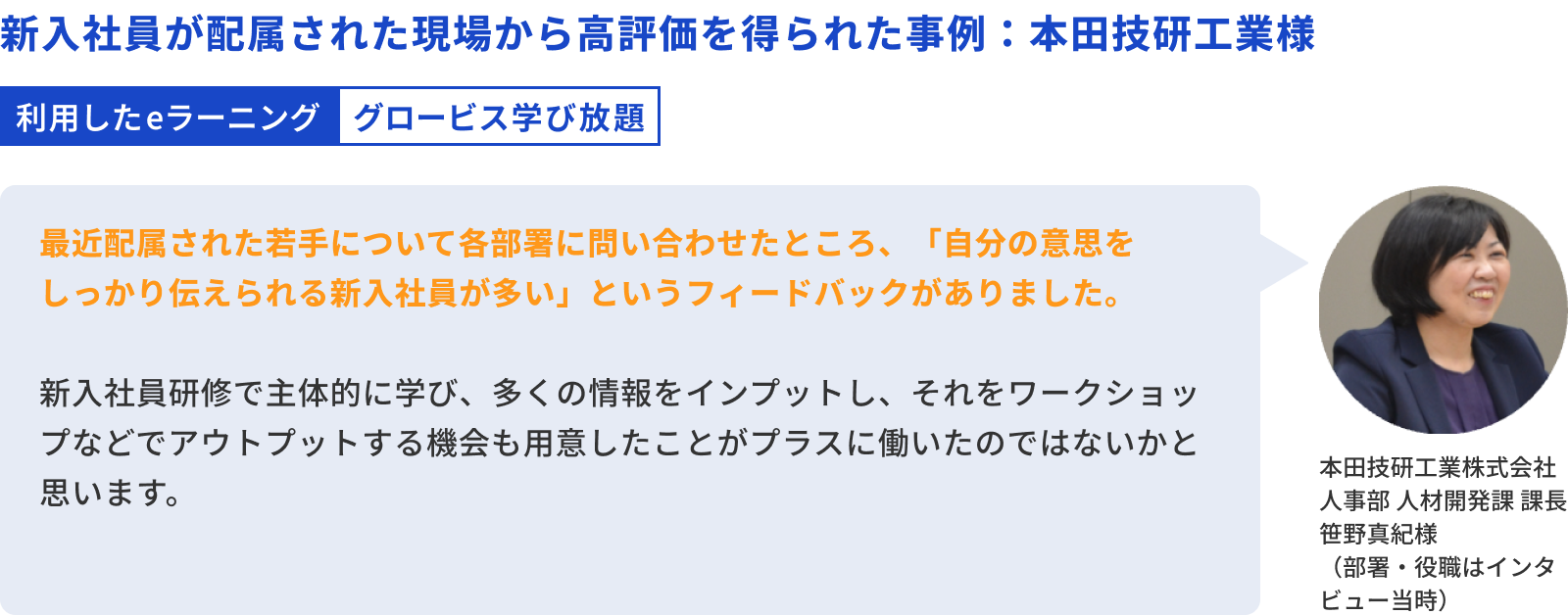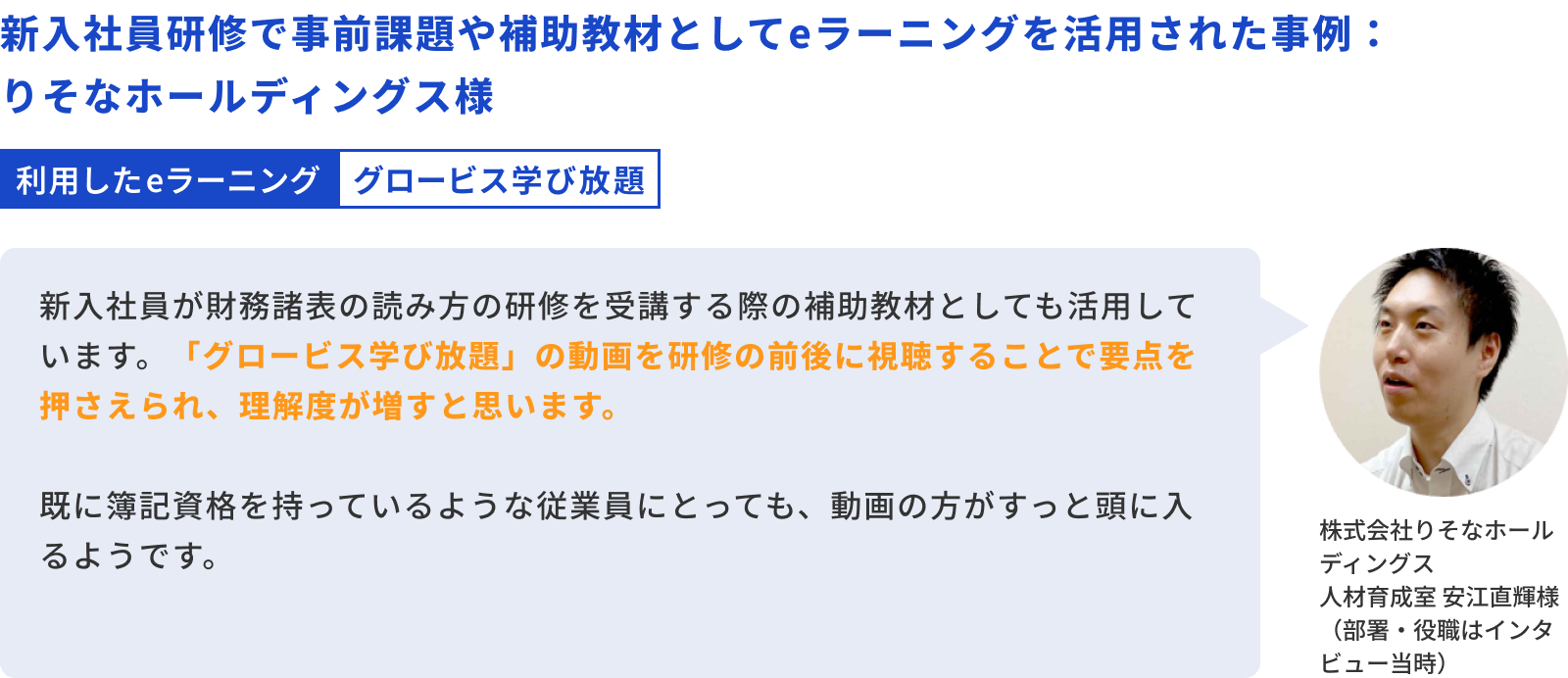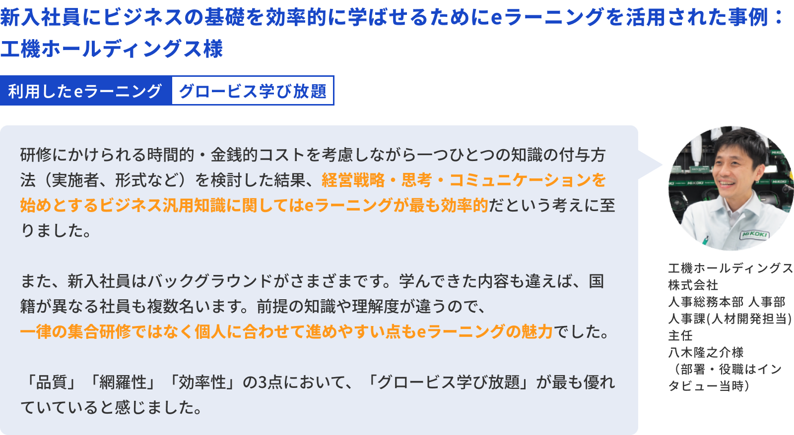 | 導入後の効果・成果 | ⚫︎提出物の内容から、「グロービス学び放題」導入前の新入社員と比べて思考力が身についたと感じられる |