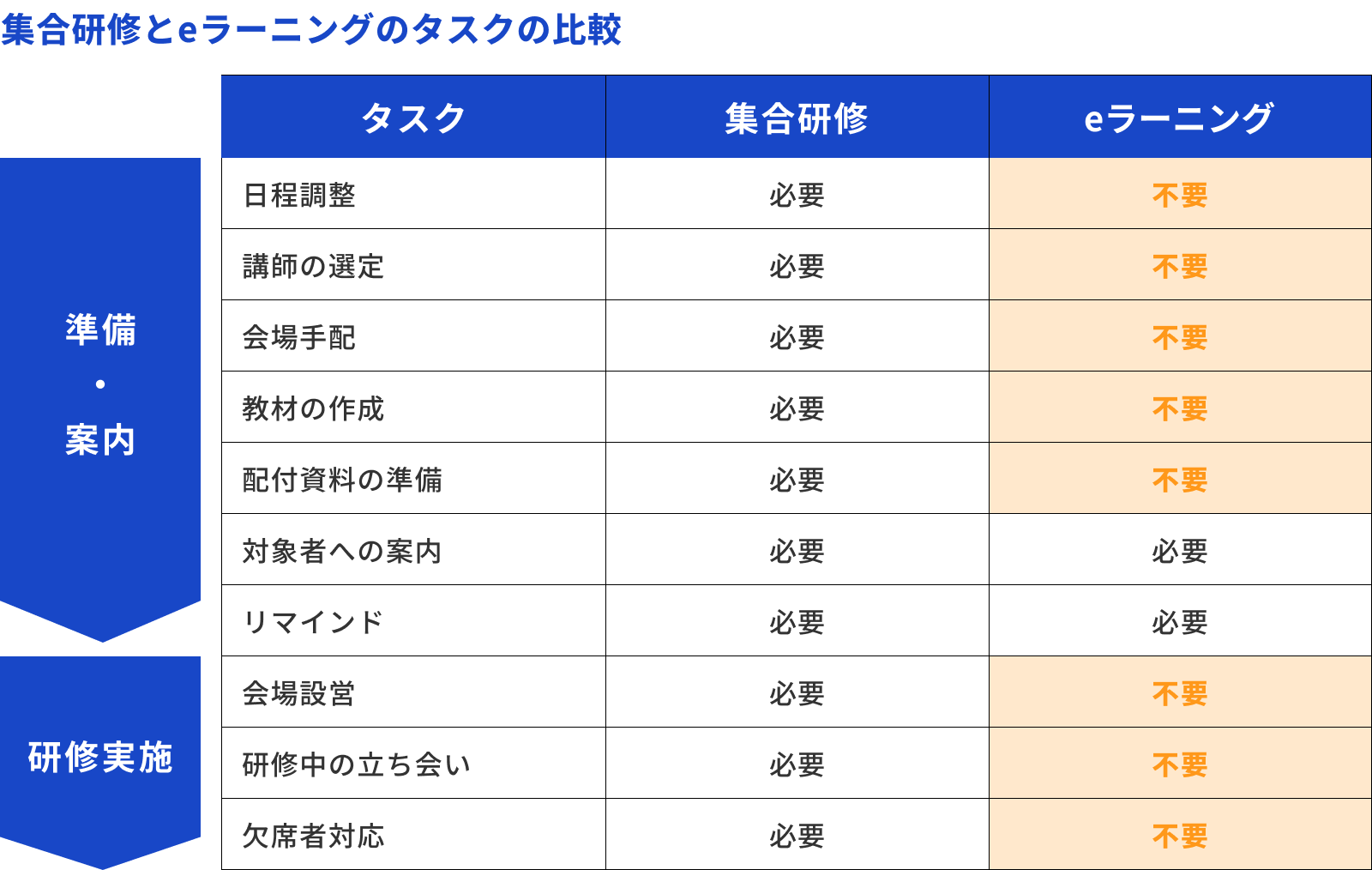 前述の通り、eラーニングは集合研修と異なり、講師派遣料や会場費用、教材費用などがかかりません。つまり、それに対応する人員も不要であるということです。講師の選定や会場手配、教材の作成、さらには当日の立ち会い、欠席者対応など、集合研修の際に人材育成担当者が担う業務が、eラーニングでは発生しません。
