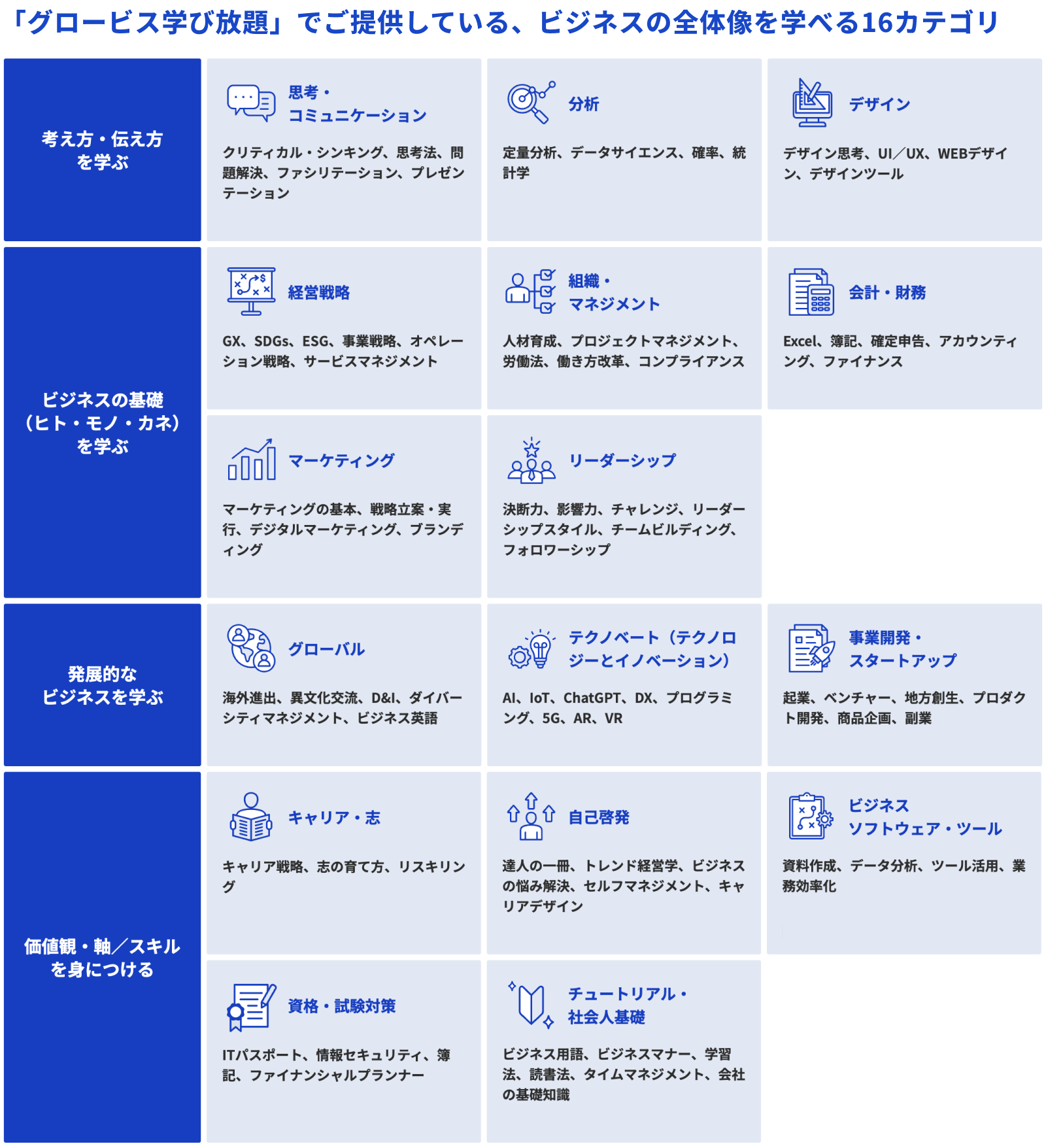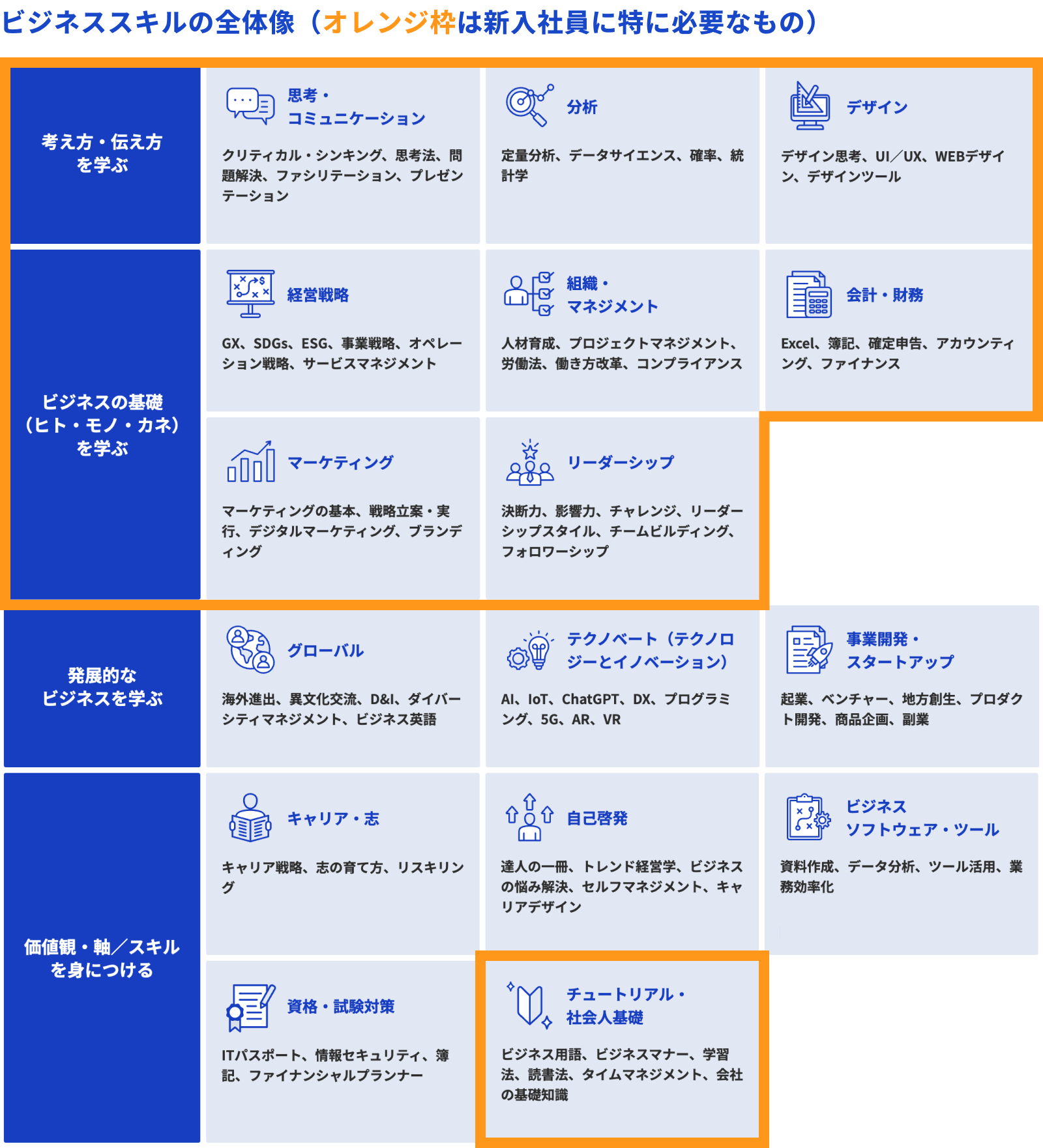 「汎用的なビジネススキル」を具体的にイメージしていただくために、グロービスの動画学習サービス「グロービス学び放題」でご提供している動画コンテンツのカテゴリー一覧を例に挙げてご紹介します。新入社員に対しては、オレンジ枠で囲った部分の学びが特に必要になるでしょう。