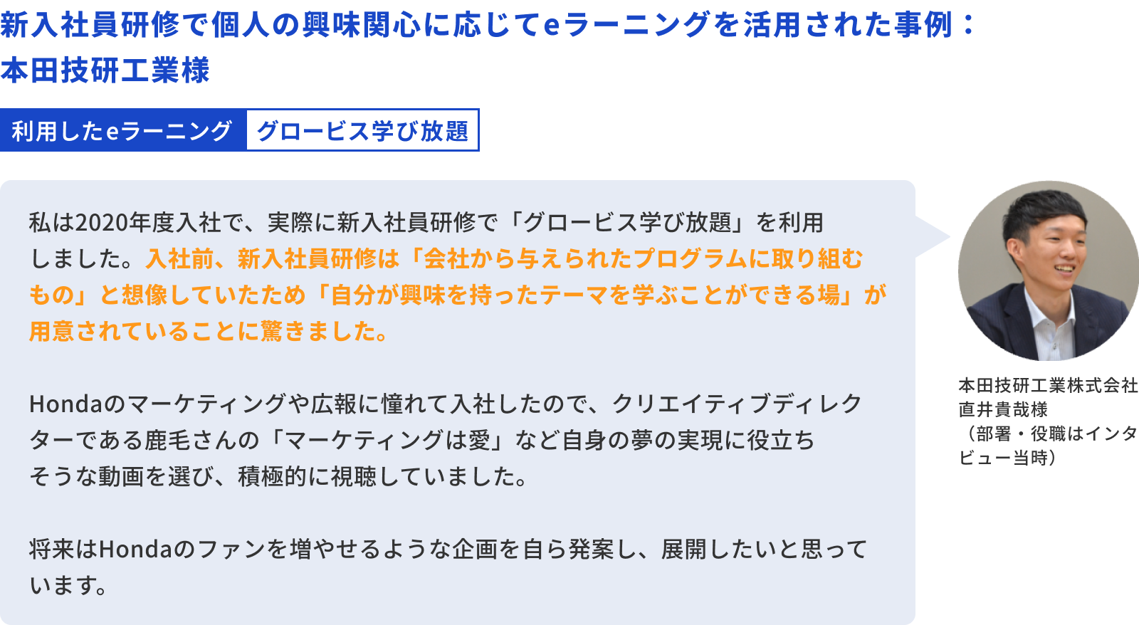 今、多くの企業が“社員が自律的に学ぶ風土醸成”に課題意識を持っています。社会人になったばかりの早い時期からこのような姿勢が身につくことは、会社にとって喜ばしいことでしょう。