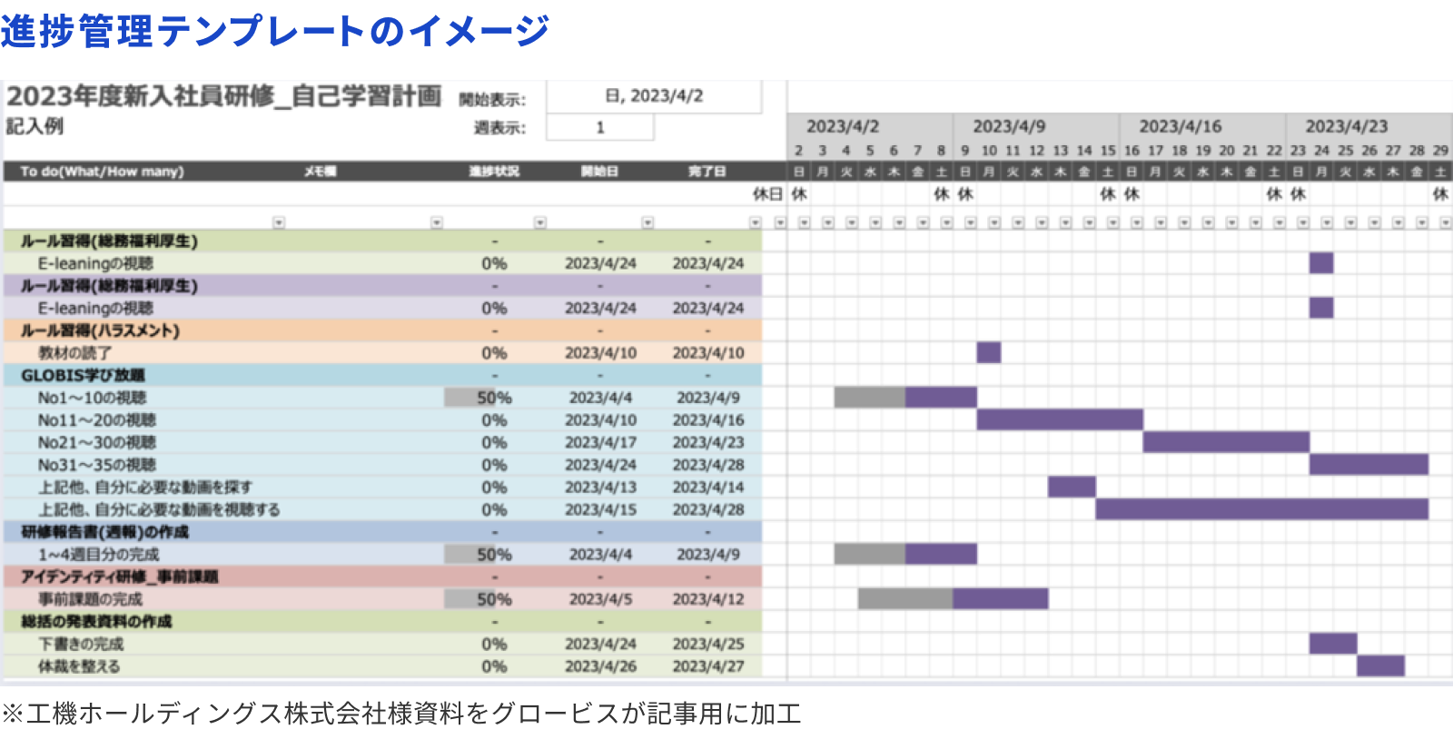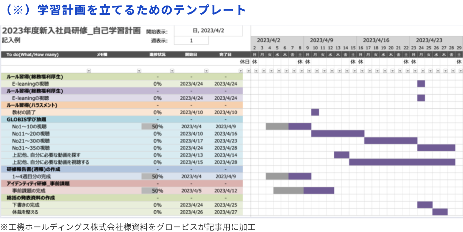 新入社員に必要なビジネス汎用スキルの習得を目指して、eラーニング「グロービス学び放題」を活用。学習計画表のテンプレートや振返りの仕組みを提供し、自己学習が進むよう工夫されました。
