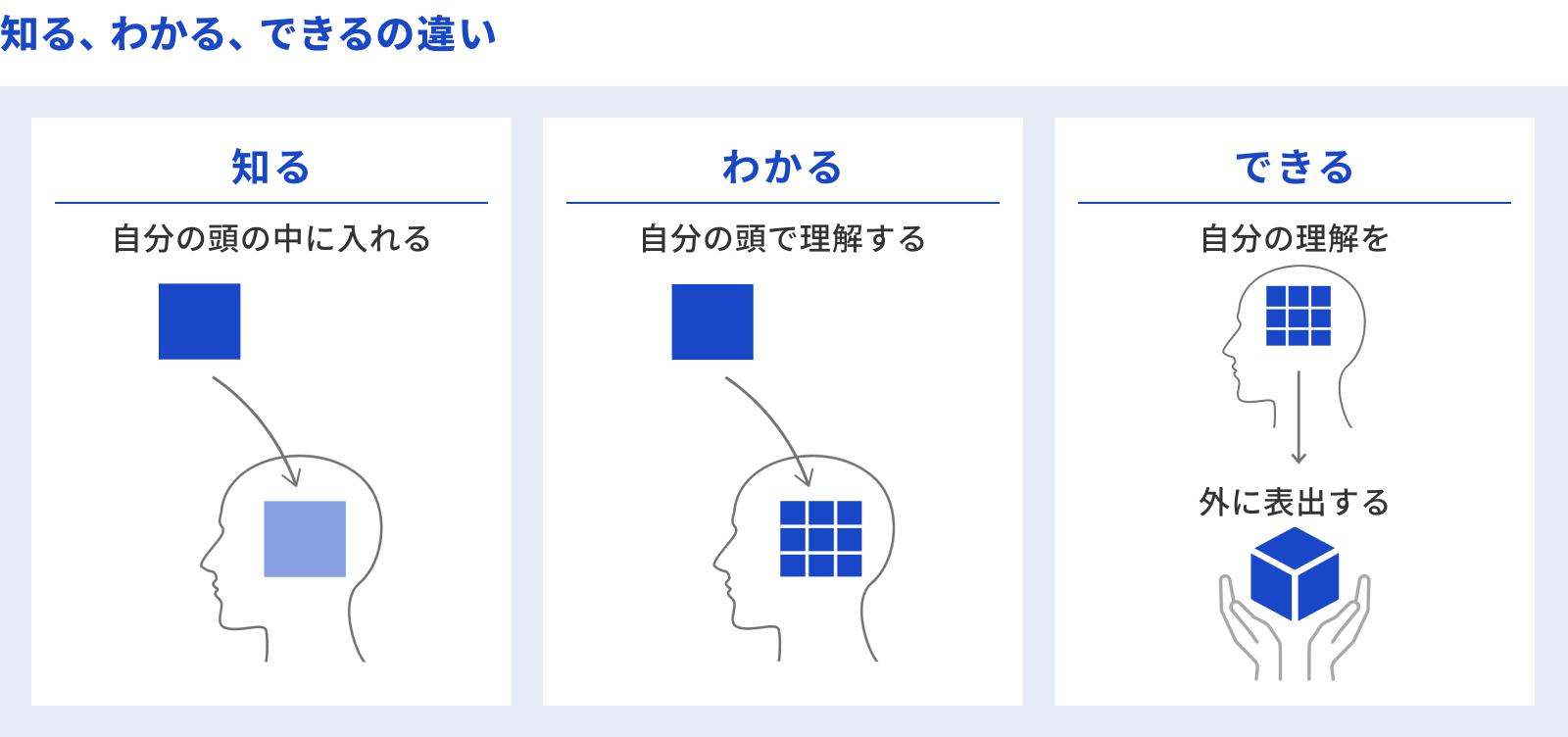 eラーニングは「知る」から「わかる」の段階で、集合研修は「わかる」から「できる」の段階で活用すると、それぞれのメリットを最大限享受できるでしょう。