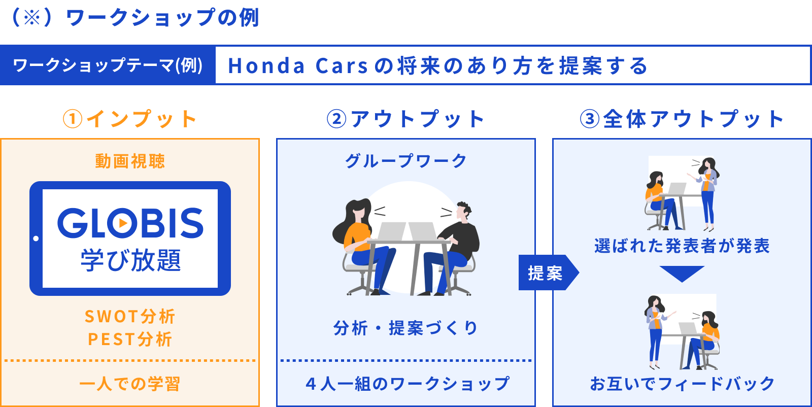 - 自社の将来のあり方を提案するワークショップを実施する場合、3C分析やSWOT分析、PEST分析といったビジネスのフレームワークについて、事前にeラーニングで学んできてもらう