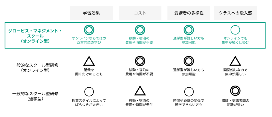 スクール型研修では、職種や年齢などバックグラウンドの異なるビジネスパーソンと切磋琢磨する環境が提供されます。他者との交流で多様な視点・価値観を得たうえで、自社内メンバーと研修や討議をすることで学びを深める立て付けとなっています。