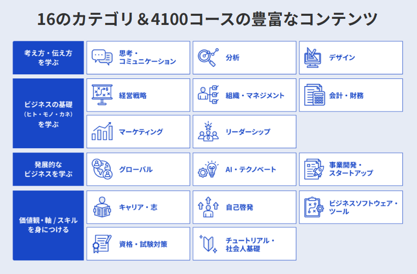 グロービスが提供する、「グロービス学び放題」では16カテゴリ、4,100コースの動画コンテンツで幅広い興味関心に応えることができます。