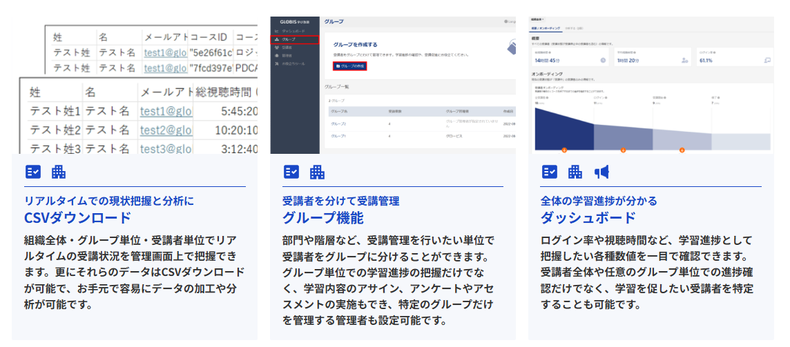 「グロービス学び放題」は、約30年間の支援による知見が活かされたグロービスのeラーニングです。受講者側だけでなく管理者の担当者が使いやすいシンプルなUIUXと伴走支援により、様々な企業に導入されています。