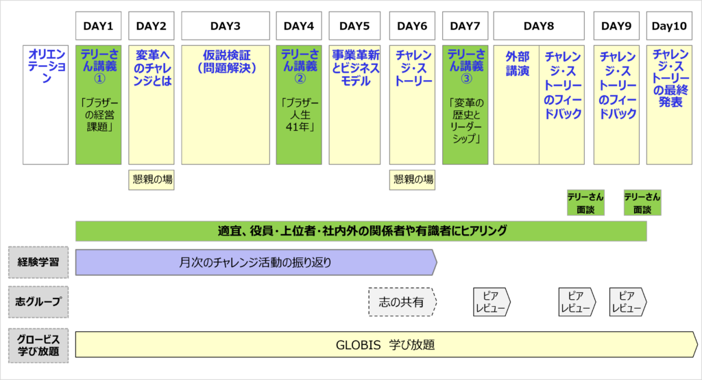 | 導入背景 | ⚫︎変革をリードできるチャレンジ精神を持った人材を育てたい、という当時の社長の強い想いから研修プログラムを発案した ⚫︎中期戦略で掲げられた変革風土の醸成と、会社のDNAであるチャレンジ精神という経営理念の浸透を目的としていた |