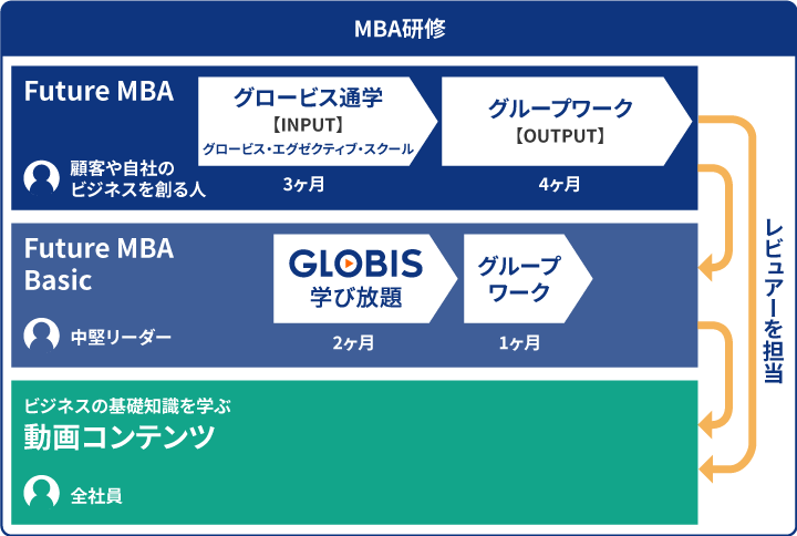| 導入背景 | ⚫︎中堅リーダー層向けの研修「FutureMBA basic」を企画した際、多数の受講者が効率的に学べるインプットツールを探していた ⚫︎多様なコースが体系的に学べる点や研修目的に合致しており、導入を決定した |