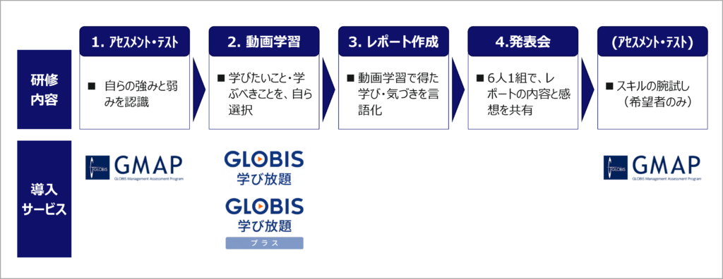 | 活用内容 | ⚫︎GMAP(グロービスのアセスメント・テスト)で自らの強みと弱みを認識したうえで、「グロービス学び放題」で各自学んでもらう構成にした ⚫︎受講後には学んだ内容をレポートにまとめ、受講者同士で共有する発表会の場を設けた |