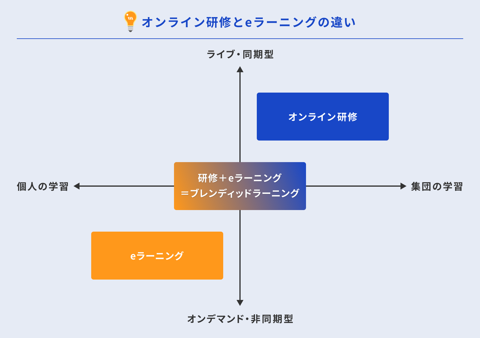 上で述べたように、オンライン研修と eラーニングは 「同期型×集合学習」「非同期型×個人学習」というそれぞれ対極の強みを持っています。