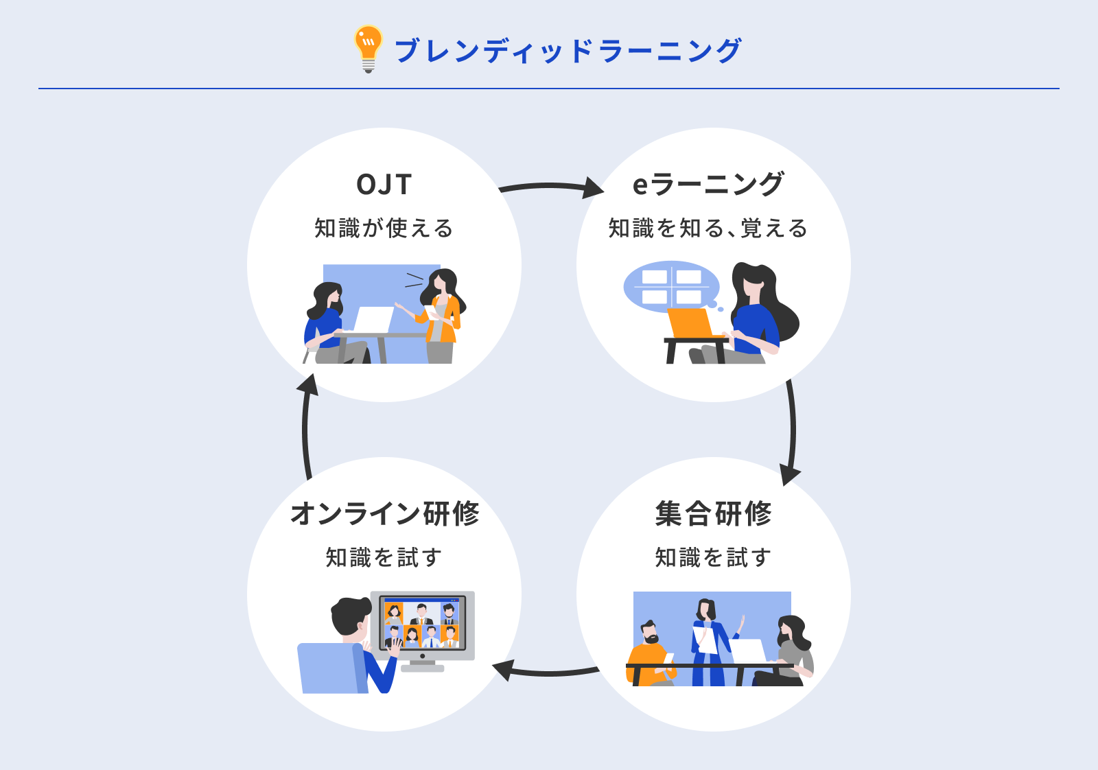 ブレンディッドラーニングとは、研修やeラーニングなど複数の育成手法を組み合わせる(ブレンドする)学習形態のことです。オンライン研修、eラーニングなどそれぞれの研修手法には、メリットとデメリットがあります。それらを組み合わせることによって、短所を補完して長所を活かすことで、理想的な学習のサイクルを作ることができます。